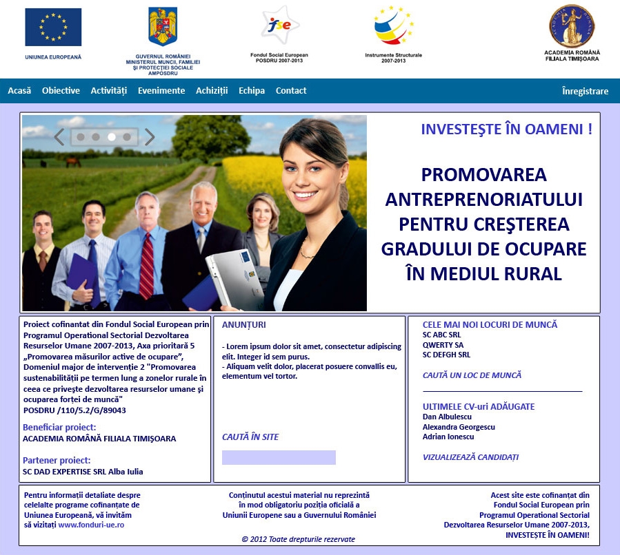 Proiect cofinanţat din Fondul Social European prin Programul Operaţional Sectorial, Dezvoltarea Resurselor Umane 2007 – 2013, Investeşte în oameni, Axa prioritară 5 „Promovarea măsurilor active de ocupare”, Domeniul major de intervenţie 5.2. „Promovarea sustenabilității pe termen lung a zonelor rurale în ceea ce privește dezvoltarea resurselor umane și ocuparea forței de muncă”
